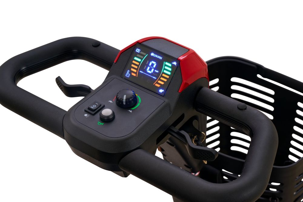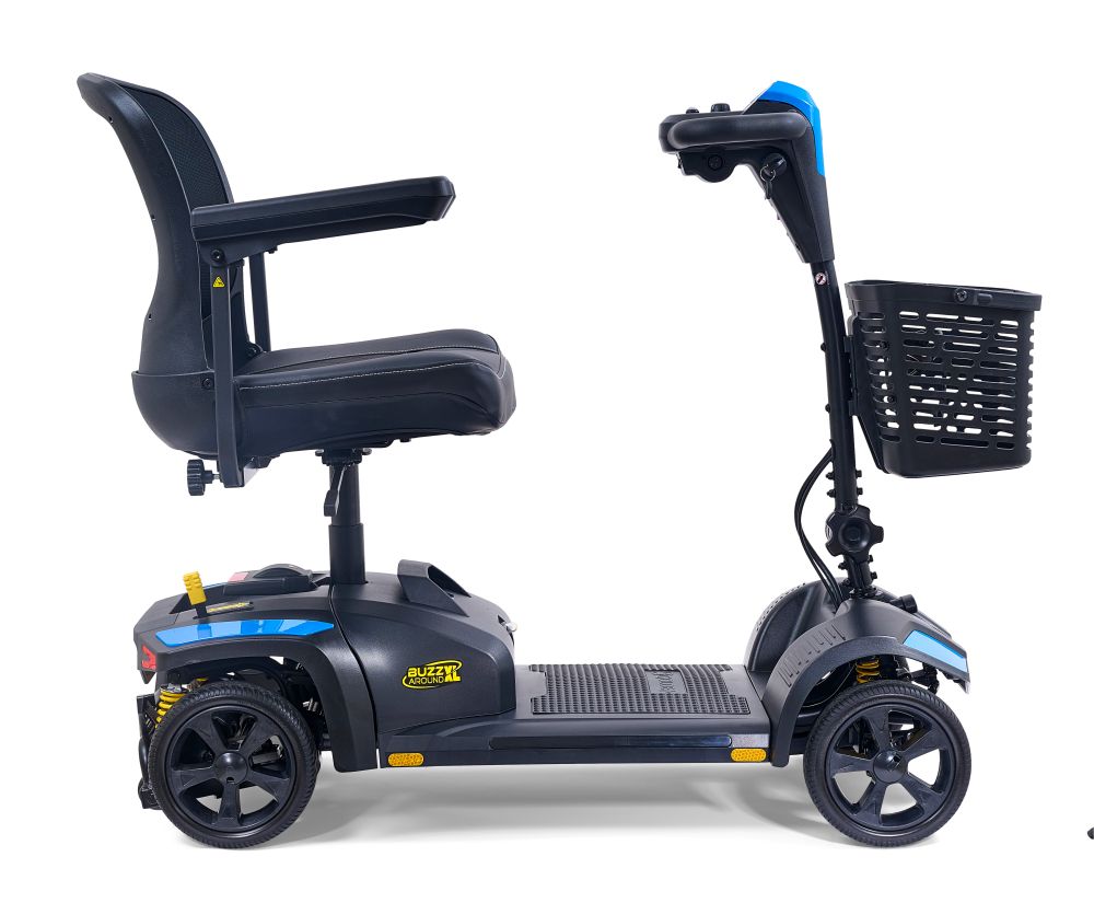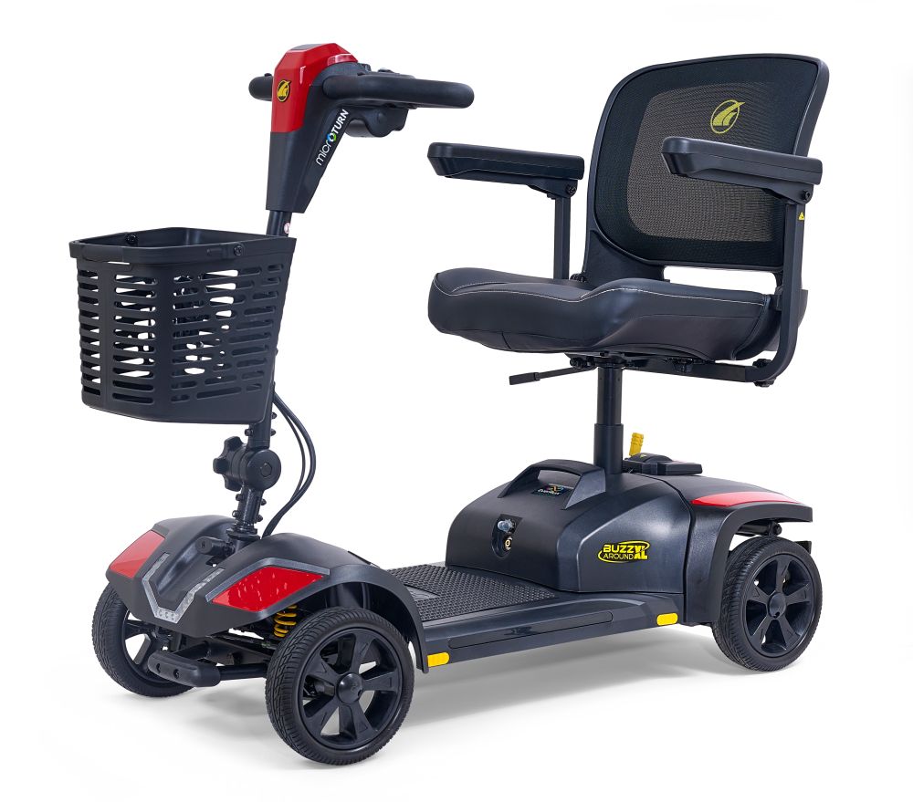 The Buzzaround XL 4-Wheel Scooter, GB150, offers improved standard features to make your riding experience better than ever. It features a large wraparound Delta tiller, higher ground clearance of 3.5", and increased weight capacity of 325 lbs. The XL also offers a new, stylish, contoured stadium-style mesh seat for more comfort and increased airflow. The LED dash is full color with speed and battery indicators, and the basket includes a built-in drink holder. The GB150 offers our new MicroTurn™ technology with an impressive 39" turning radius to navigate even the tightest spaces with ease!