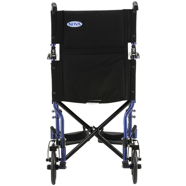 The Lightweight Transport Chair has a lightweight aluminum frame and padded upholstery. It is foldable and has a quick release fold-down back, as well as padded, fixed full-length arms for added comfort. This transport chair has locking rear wheels.